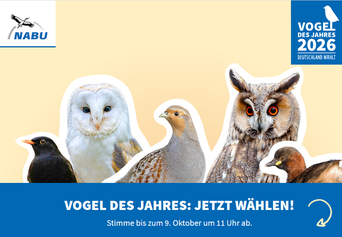 Das digitale Wahlbüro zur Vogelwahl ist geöffnet. Fünf Vogelarten stehen bis zum 9. Oktober zur Wahl: Amsel, Schleiereule, Rebhuhn, Waldohreule und Zwergtaucher. Welcher der Kandidaten macht das Rennen zum Vogel des Jahres 2026?
